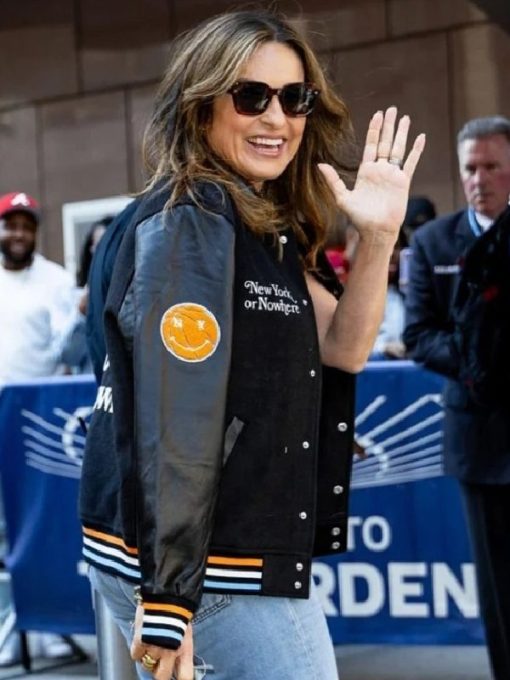 Make a statement with the Knicks Playoff Game Mariska Hargitay Jacket, modeled after the acclaimed actress’s memorable look from Game 3 of the Celtics vs. Knicks Playoffs. Celebrated for her commanding presence and refined style, Mariska introduced a striking varsity flair to the NBA stage now you can embody that dynamic energy.