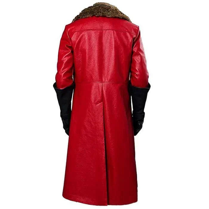 Men's Red Leather & Faux Fur Trim Long Coat - Festive Christmas & Cosplay Outerwear