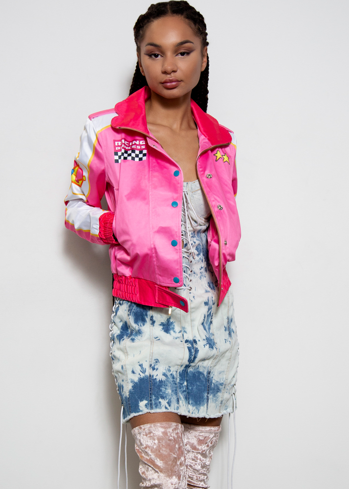 Crafted with premium materials, it features a sleek silhouette, ribbed cuffs and hem, and racing graphics that give it a unique personality. Whether you’re heading to a party, a casual day out, or just want to elevate your streetwear look, this jacket brings confidence, charm, and princess-worthy style.