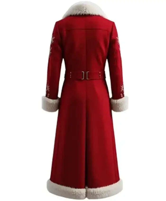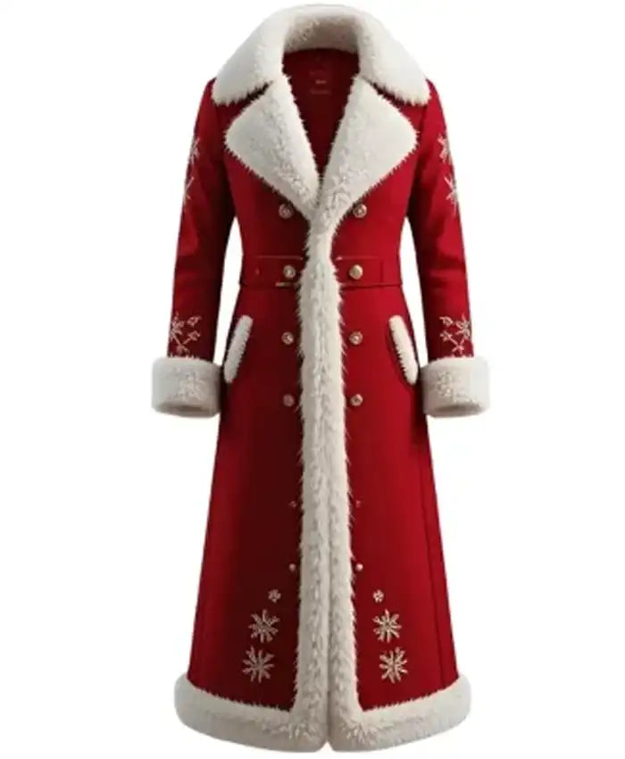 The delicate snowflake detailing along the sleeves and lower front of this rich crimson trench coat instantly evokes festive charm, making it an essential addition to any winter wardrobe. This elegant long coat blends luxurious comfort with unmistakable holiday allure, crafted for those who appreciate sophistication with seasonal flair.